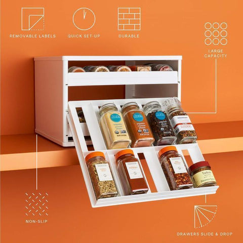 The best moments aren't spent searching through your cabinets.You need a home organization product that adjust to fit into everyday, so you have more time for activities and people you love. Together we can find this Spice Bottle Organizer, where trivial storage issues are gone and life rolls on.Universal flip-down Organizer fits both round and square spice bottles, and we even included blank removable labels so you always know what spice you're grabbing.A more easy access to your spices.